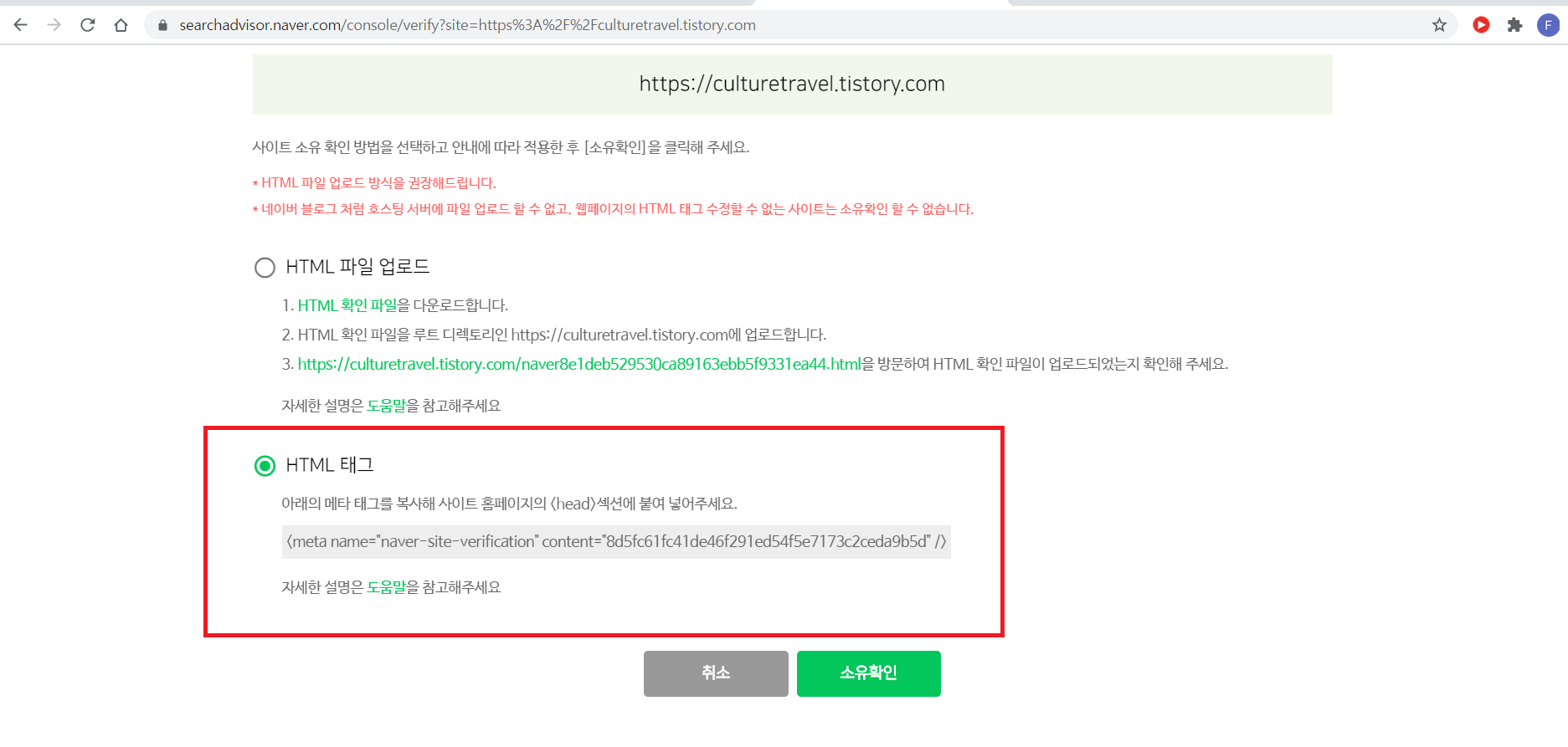 네이버 웹마스터도구 사이트로 돌아가 소유확인 해주시면 끝!