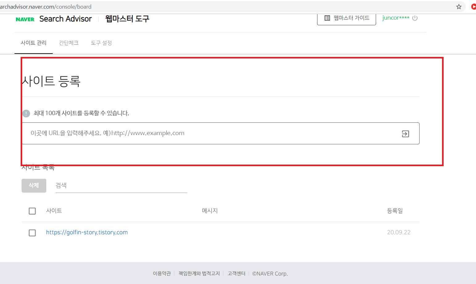 티스토리 블로그 주소를 <사이트 등록>에 입력합시다,