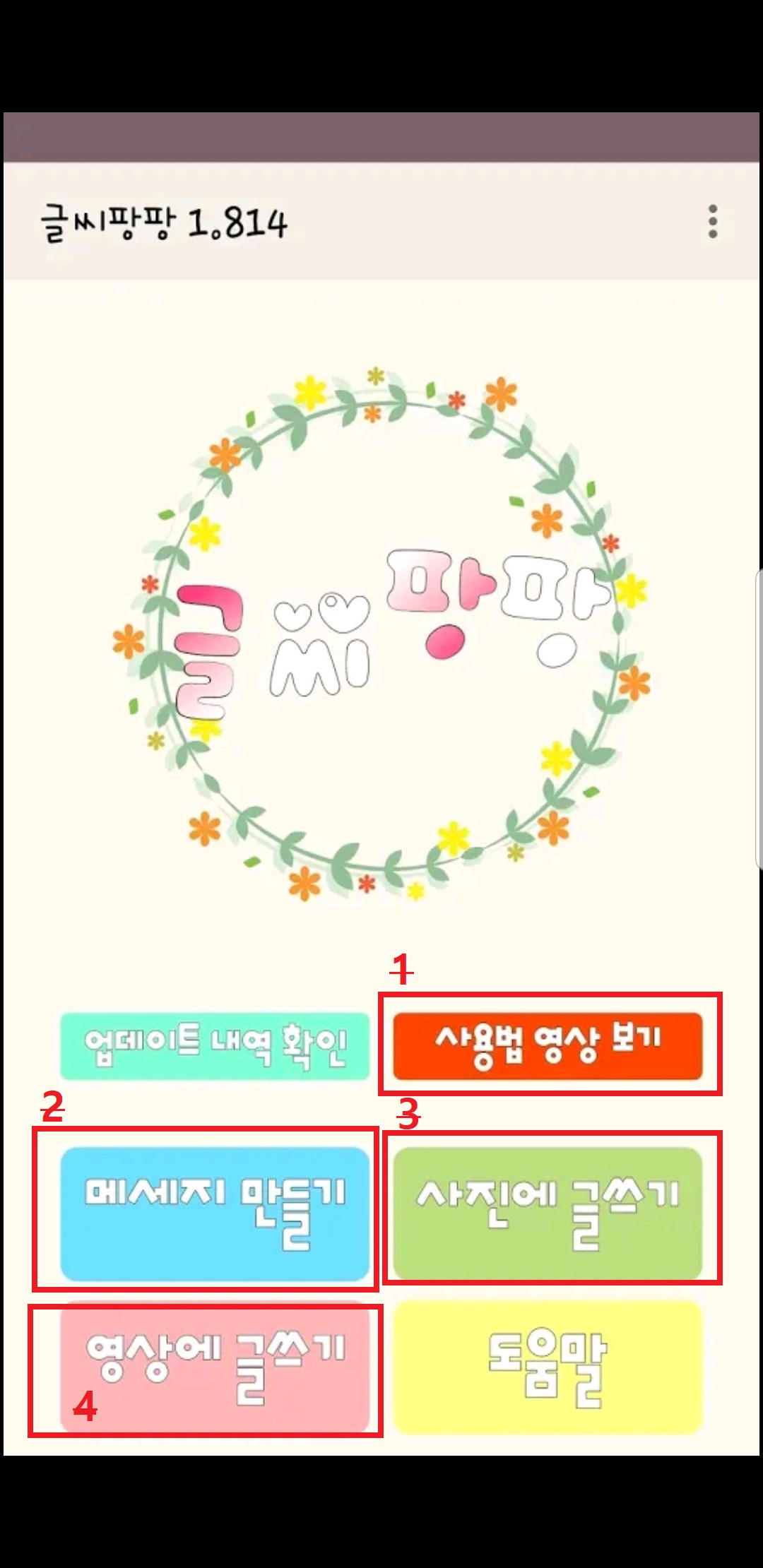 1.사용법영상 / 2.메세지 만들기 / 3,사진에 글쓰기 / 4.영상에 글쓰기